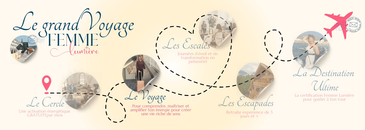 Le Voyage fait partie du Grand Voyage Femme Lumière, un chemin d’éveil et de transformation conçu pour les femmes prêtes à rayonner pleinement leur essence.